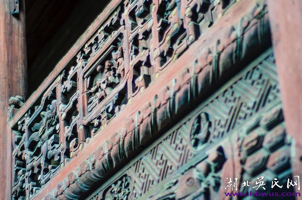 前幢進深6米,分上下兩層,明間上層向院內(nèi)伸出,形成一面積約40平方米的戲臺,戲臺與兩側鐘鼓室,后臺連成一體,呈凸字形,由門道干墻和16根圓柱支撐。正中有屏風、旁開上、下場二門,戲臺正上方有八角形藻井,彩繪“太極八卦”等圖案。其下檐正中豁出,鑲“觀樂樓”金字橫匾。柱間有大枋、懸枋,大枋與懸枋間有券柵。戲樓正面與正殿相對,兩側有回廊,戲臺配房與回廊有過道相通,回廊有臺階與正殿相連,中間形成院落。回廊既作通道,亦可作為看樓使用。觀樂樓戲臺前沿橫枋通長8米,高0.5米,采用浮雕與鏤空雕技法展現(xiàn)了武漢古鎮(zhèn)的壯美景致和繁華景象,畫面雄偉壯觀,氣勢非凡,且工藝精湛,立體感強。