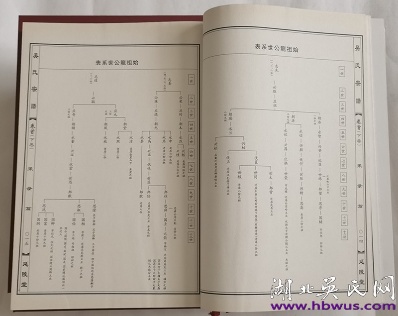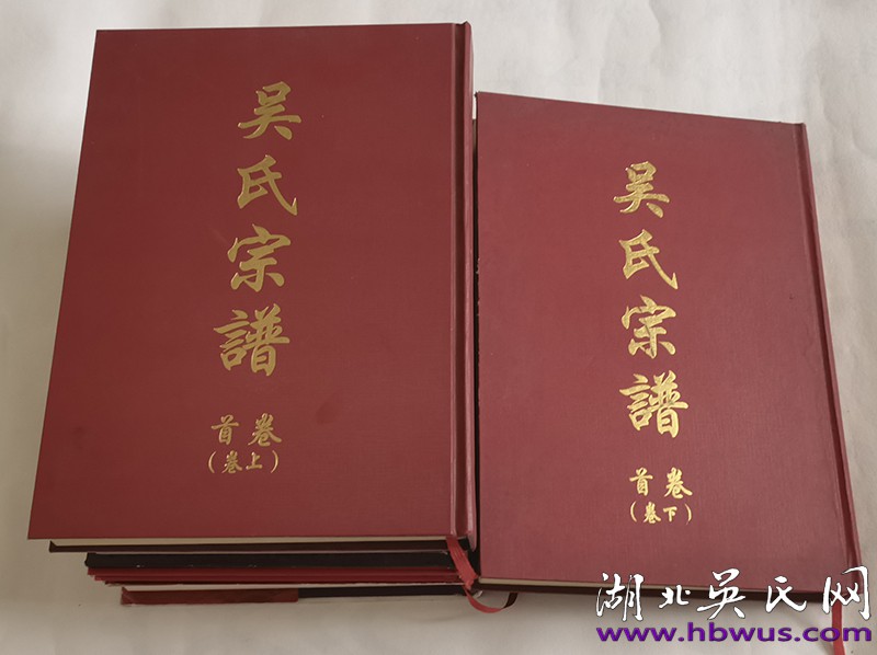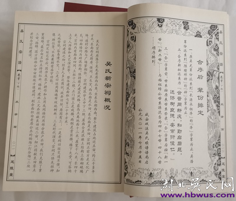 卷首分上下兩冊,上卷分《綜合篇》和《源流篇》,《綜合篇》為凡例、圖騰、族徽、先祖像、墓圖等?!对戳髌肥珍浻性戳鞲?、世系歌、譜序、圣諭、誥命、續(xù)譜名錄、定居圖、山圖、五服圖等。下卷分《采錄篇》、《風(fēng)采篇》及《附錄》,《采錄篇》為宗祠照片、頌詞、合序輩份、建祠合譜始末、總吊系圖、族規(guī)、族戒、十勸歌、為人歌等;《風(fēng)采篇》為各莊門簡介簡圖、捐資名單、名人贊、徳孝節(jié)義人物事跡簡述、題名記人丁統(tǒng)計表等;《附錄》為吳氏文化、甲子紀年、時辰時刻換算表,咸安吳氏各莊戶數(shù)人口初錄及古地圖轉(zhuǎn)登、編后記等。卷一至卷六為各莊門世系,懷邦莊,吳龍老居二份、八份,光祿莊為第一冊;吳龍老居四、五、六份為第二冊;老居七份、吉堂莊、福萬莊華龍莊為第三冊;老居三份、金盆莊為第四冊;老居十份、歐卜莊、紹祖莊、位九莊為第五冊;吳浩老居、興隆寺為第六冊。