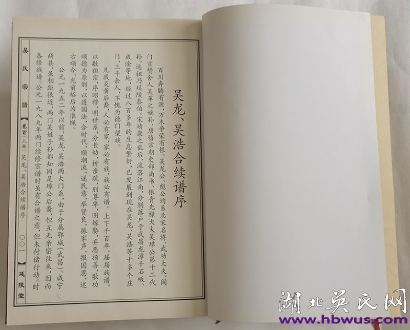 本譜為咸寧雙溪吳龍、吳浩及其分支共十二莊門合修宗譜。吳龍支系、吳浩支系均出自湖南平江始祖吳璋之后,吳龍支始祖吳龍為璋公十二世,宋靖康之亂,由江右南昌府南昌縣朱氏巷瓦子地遷武昌近龍?zhí)叮ㄔ瓕俣醭?,解放后劃歸咸寧雙溪橋),開基立業(yè),迄今八百余載,子孫分十門份,立十三莊。吳浩支始祖德進公為璋公十二世彪公之后,元末避紅巾軍亂,由江右洪都遷咸淦雙溪橋,發(fā)展至今六百余年,分五門,立兩莊。