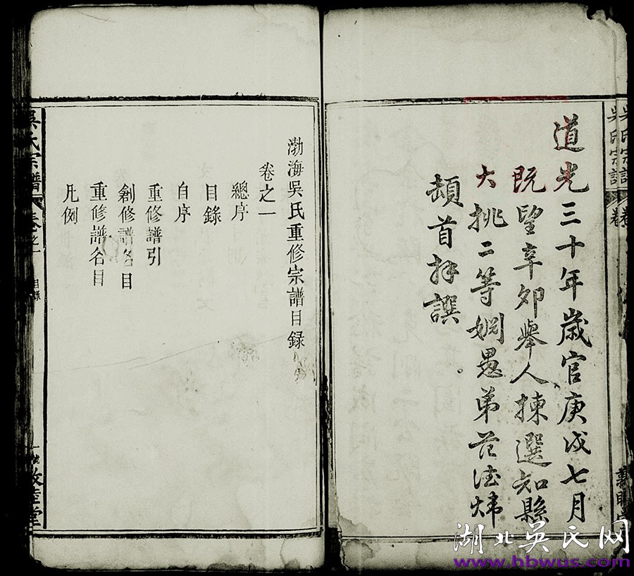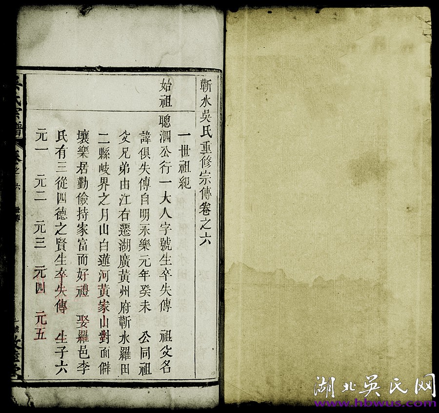 蘄水 : 即今湖北省浠水縣。散居地 : 湖北省浠水、羅田等地。書名據(jù)版心、書名頁(yè)題。分卷端題:吳氏重修宗傳。
