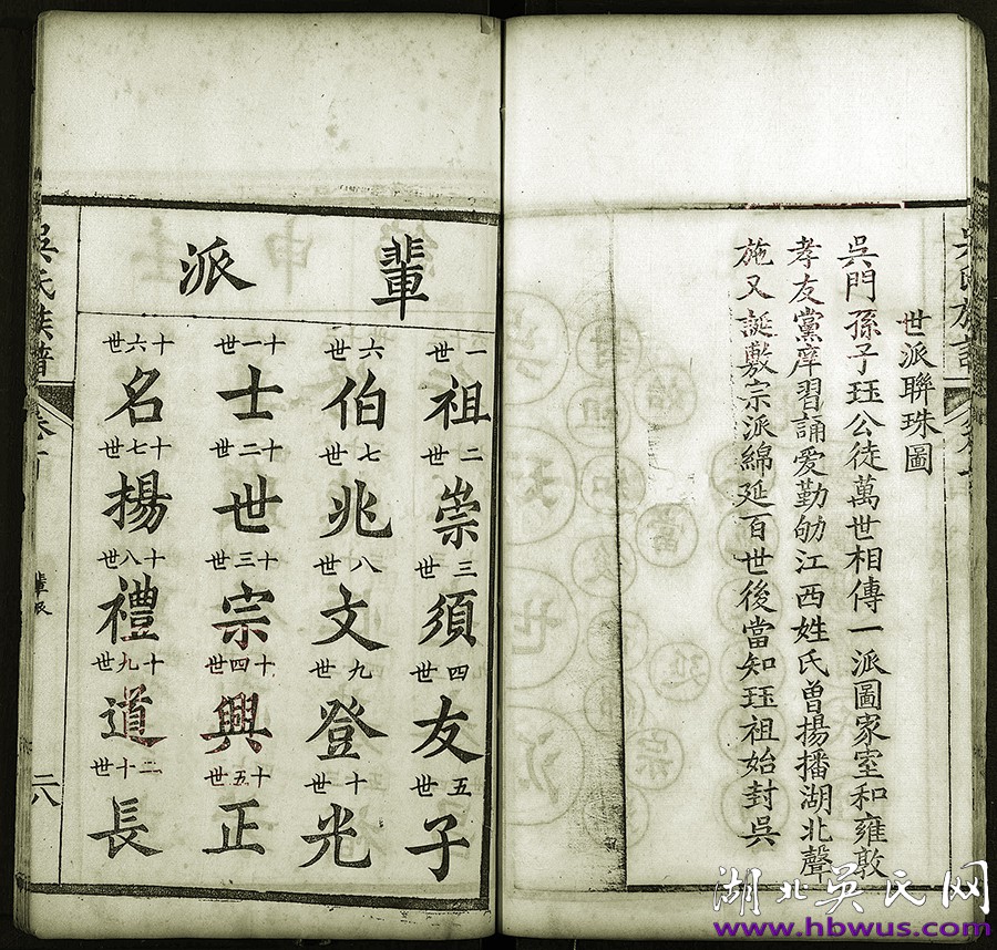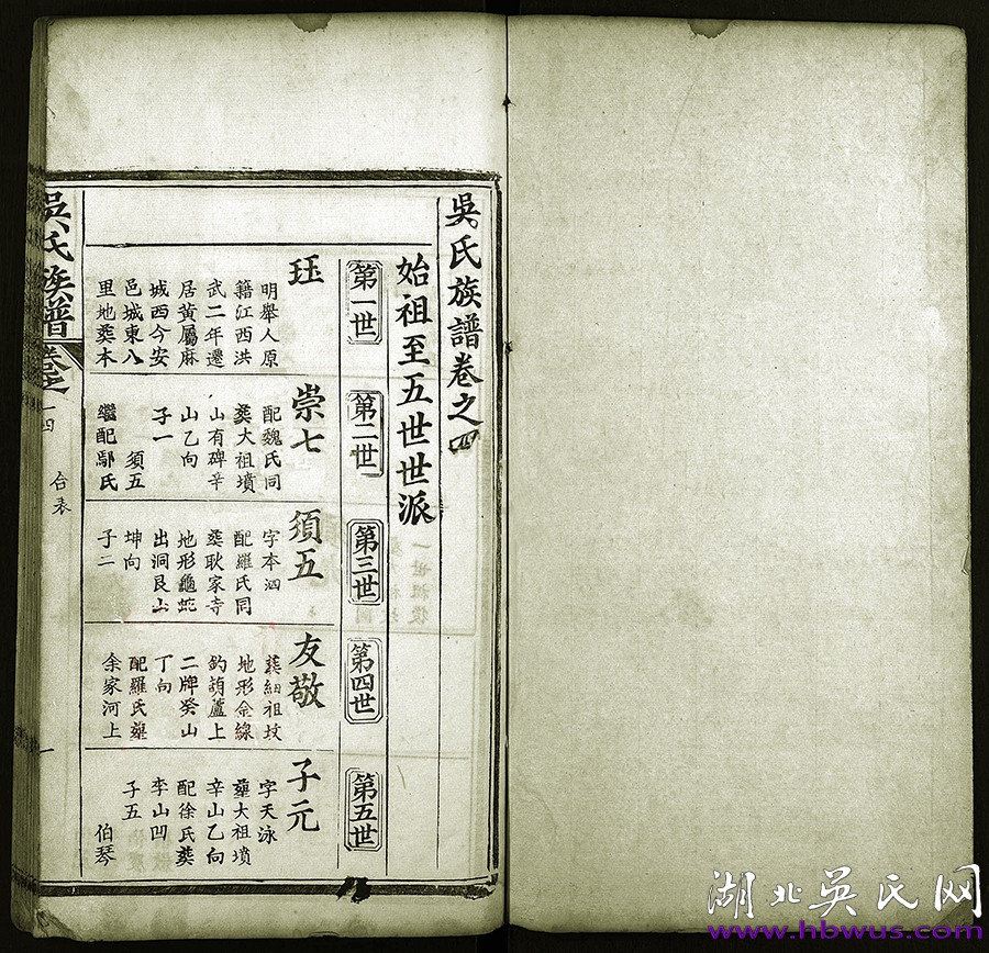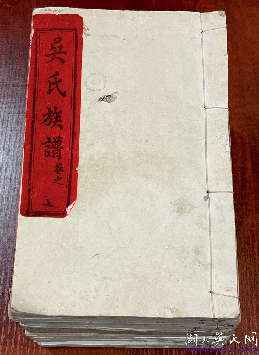 始遷祖吳玨,明洪武初由江西臨川遷湖北麻城太仙里昔歸麻邑,今隸黃安(1952年改紅安).,生子一崇七,崇七傳須五、須九(無傳),須五生友敬、友方(無傳),友敬生子元,第五世子元生五子:伯琴、伯箎(后未詳)、伯珠、伯慶、伯?dāng)?,伯琴為東分祖,伯珠為西分祖,伯慶為南分祖、伯?dāng)繛楸狈肿?,伯慶、伯?dāng)慷鬅o子失傳。此譜僅含東分伯琴, 西分伯珠二房世系。
