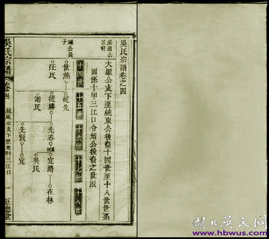 壬姑無出,以侄世英為嗣,勝公長孫世英一支改姓為高,后代復姓吳,因原居吳勝大塆之東,按地理位置劃分,世英之后為東分,文三之后為西分。