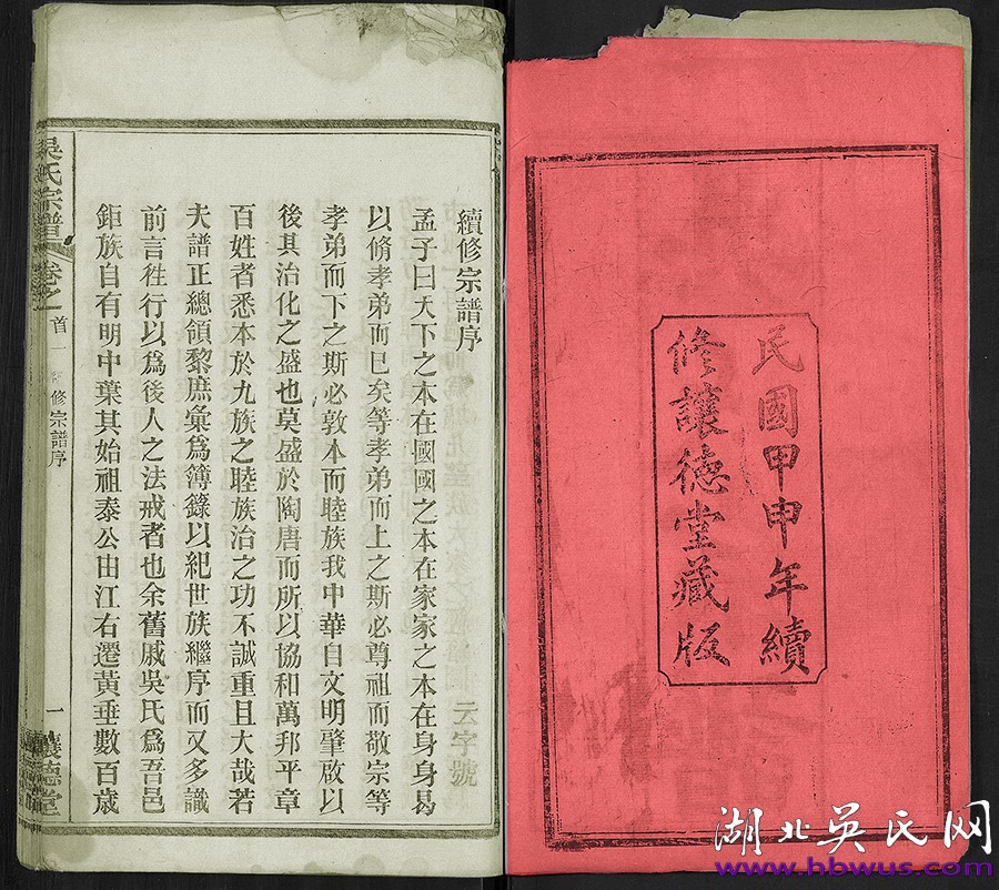 參照光緒新洲讓德堂《吳氏宗譜》條目,此為民國三十三年(1944年)三修本,記事至1944年。相較宣統(tǒng)二年二修,增加二十一世至二十五世世系,并新增五言四句二十字輩派。